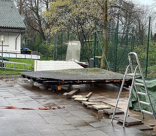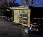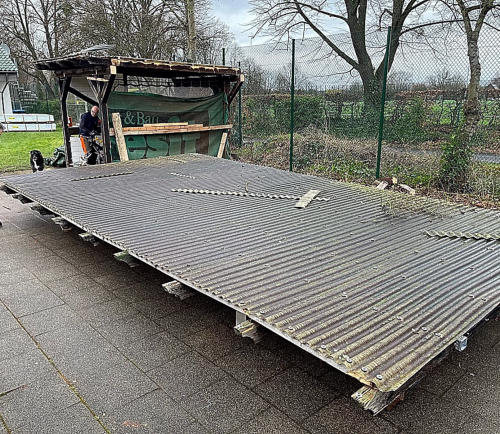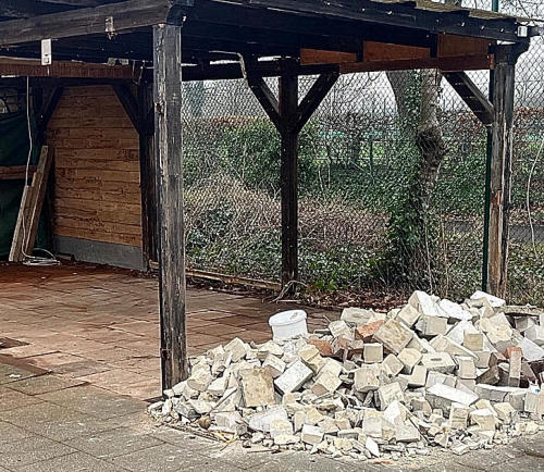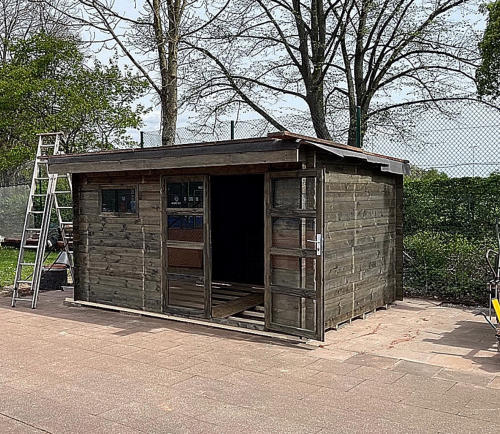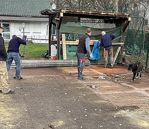 Ende des letzten Jahres wurde beschlossen, den alten und in die Jahre gekommenen Schuppenim Eingangsbereich der Anlage abzureißen und 2 neue Hütten zu errichten.So musste zunächst der alte und marode Schuppen abgerissen werden. Danach wurden Fundamente für die beiden Hütten gesetzt, deren Aufbau relativ zügig erfolgte. Die Dächer wurden abgedichtet und die Elektrik neu installiert. In der rechten Hütte befindet sich nunmehr das gesamte Equipment für denSpielbetrieb. Die linke Hütte wird von Nicky`s Pub genutzt. Ein Unterstand zwischen den beiden Hütten ist fast fertig.(Zum Vergrößern der Bilder bitte auf das Bild klicken.)